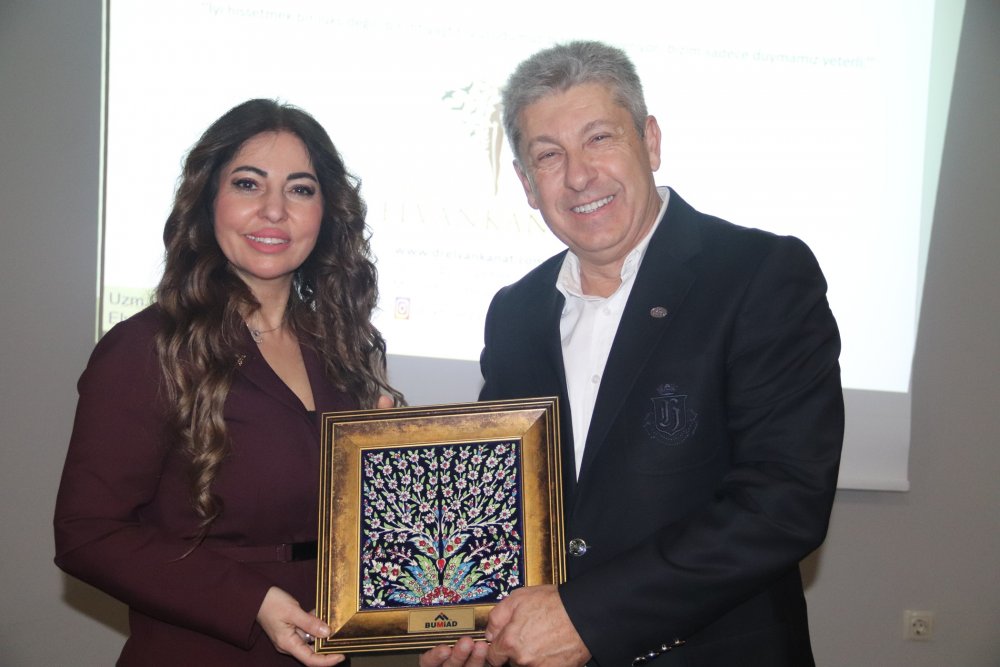 BUMİAD Başkanı Mustafa Gümüş, sunumun ardından, Fizik Tedavi ve Rehabilitasyon Uzmanı Dr. Elvan Kanat’a teşekkür plaketi takdim etti.